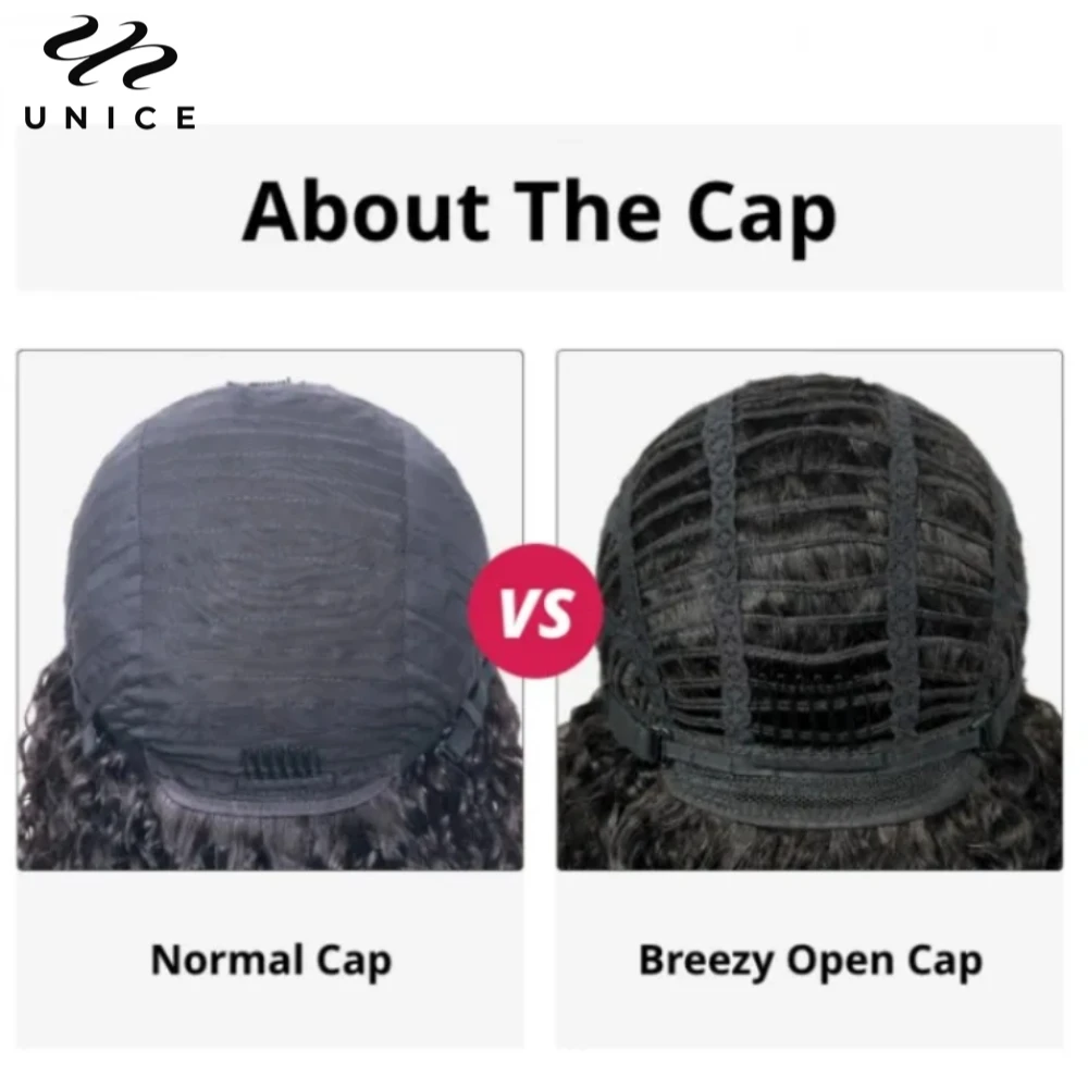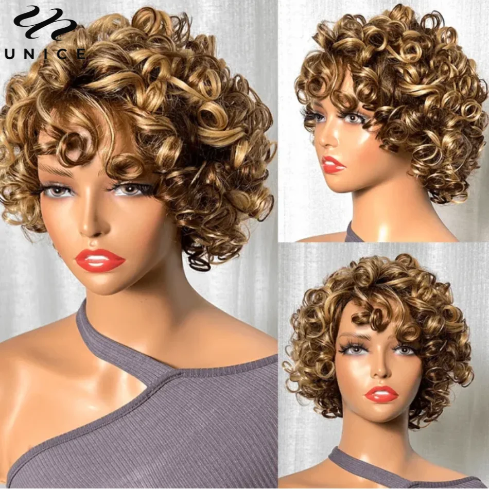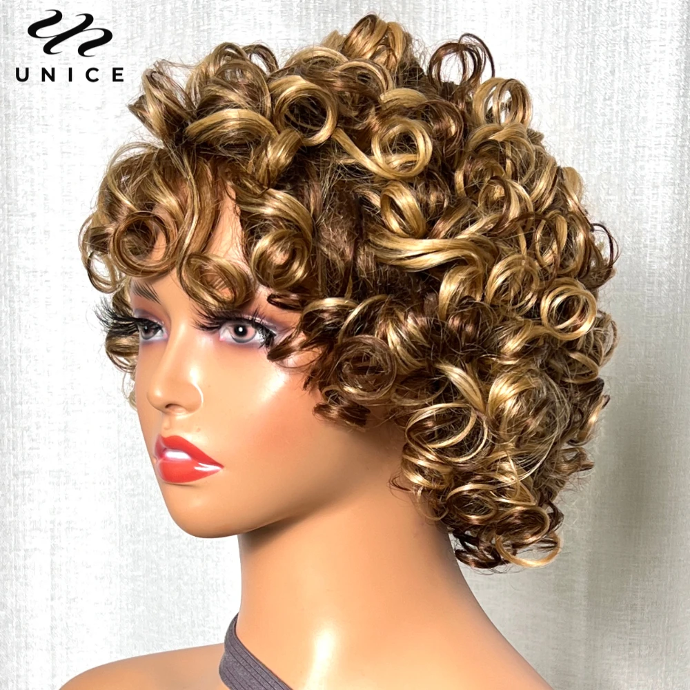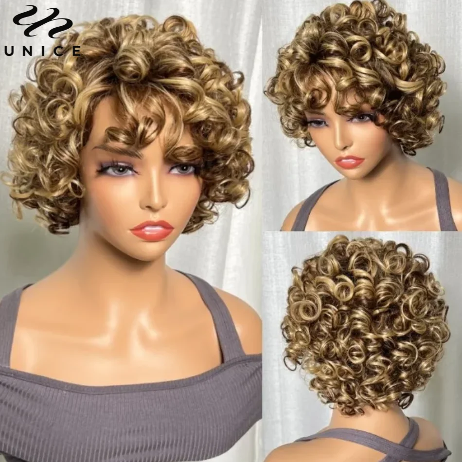 Peluca para mujer de cabello humano 100% con textura afro rizada y flequillo. Diseño hinchable con gorro abierto hecho a máquina, largo de 8 pulgadas y color rubio para un look natural, ligero y fácil de llevar. Marca UNice.