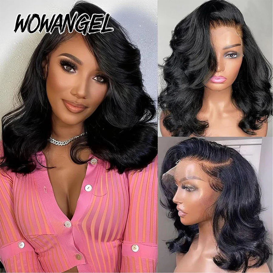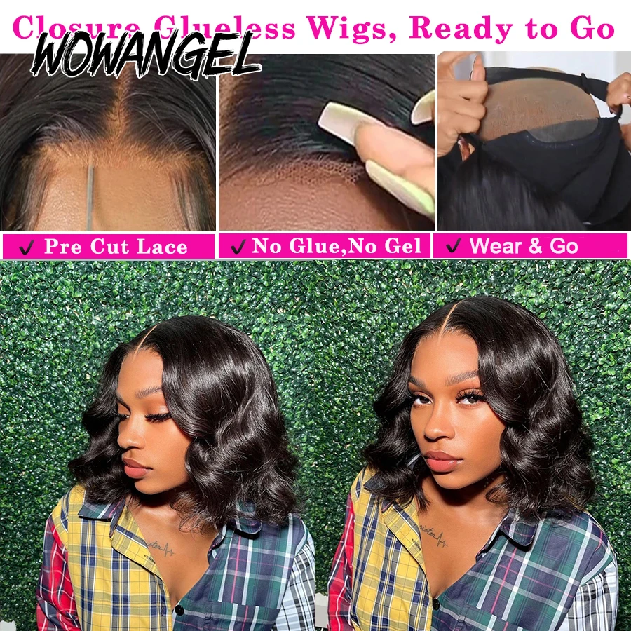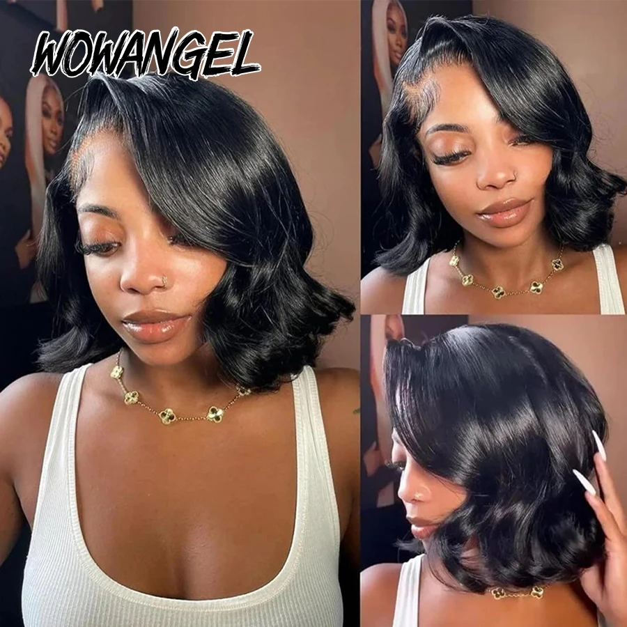 Peluca para mujer de cabello humano 100% con ondas suaves estilo bob corto. Cierre HD 5×5 precortado, diseño sin pegamento con efecto melted skin y nudos virgin Bye Bye para una línea frontal natural. Densidad 250% para un look abundante y elegante. Marca WOWANGEL.
