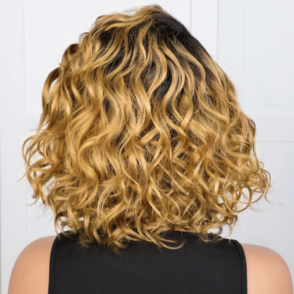 Peluca para mujer estilo bob corto rizado de cabello humano brasileño Remy con efecto rubio degradado. Encaje frontal C part 13×1, diseño sin pegamento y acabado natural, cómoda y fácil de usar. Marca Lekker.