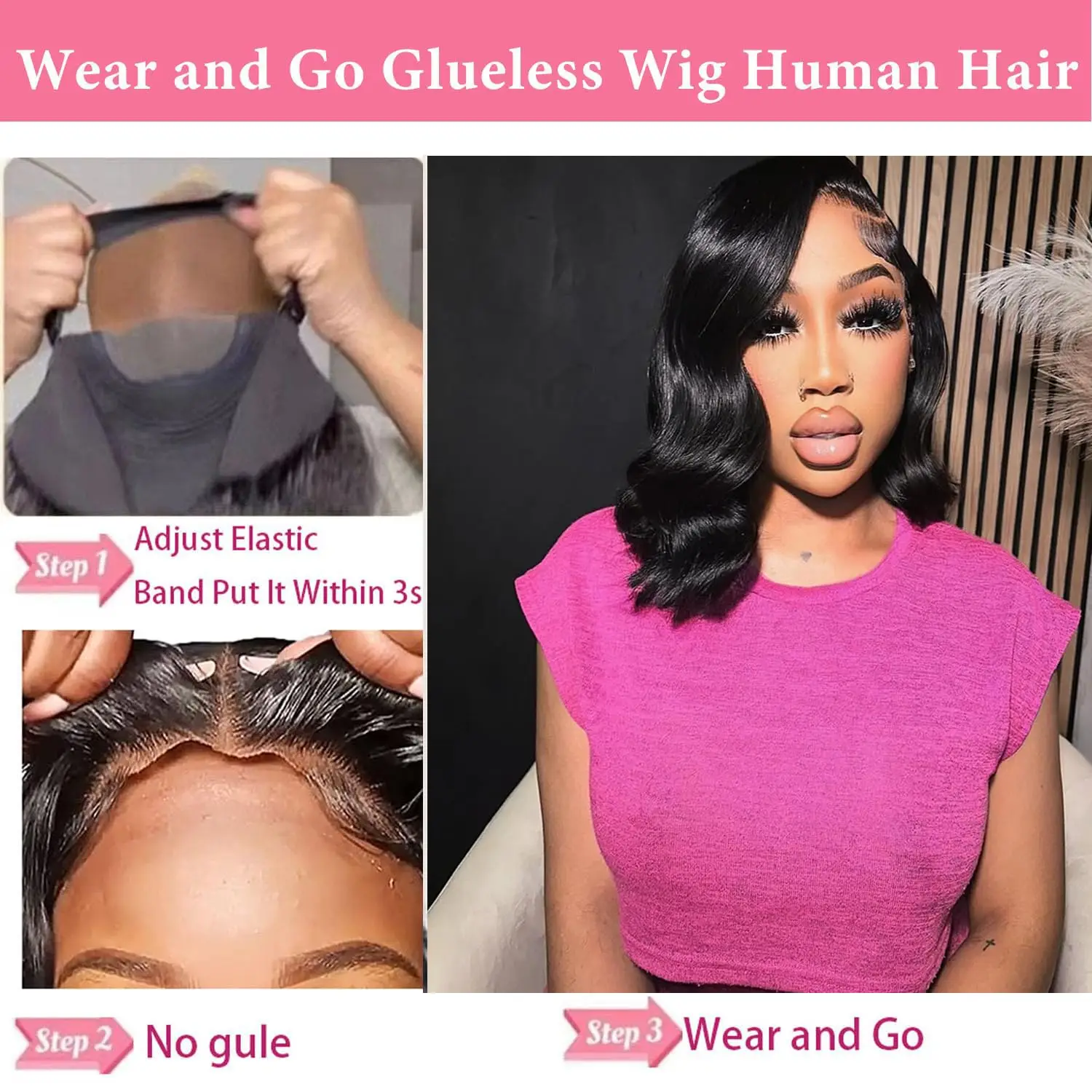 Peluca para mujer estilo bob corto de cabello humano 100% real con ondas suaves. Diseño sin pegamento con encaje HD transparente 5×5 para un acabado natural, cómodo y fácil de usar.