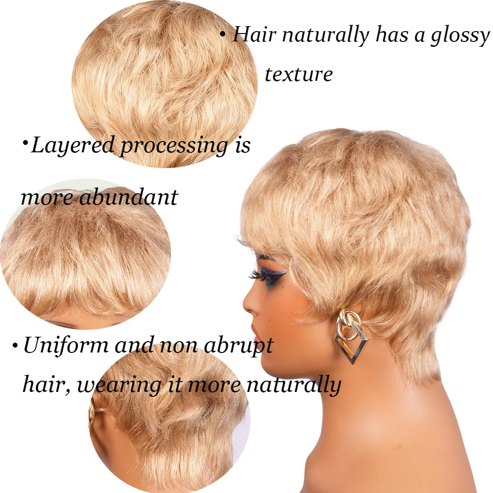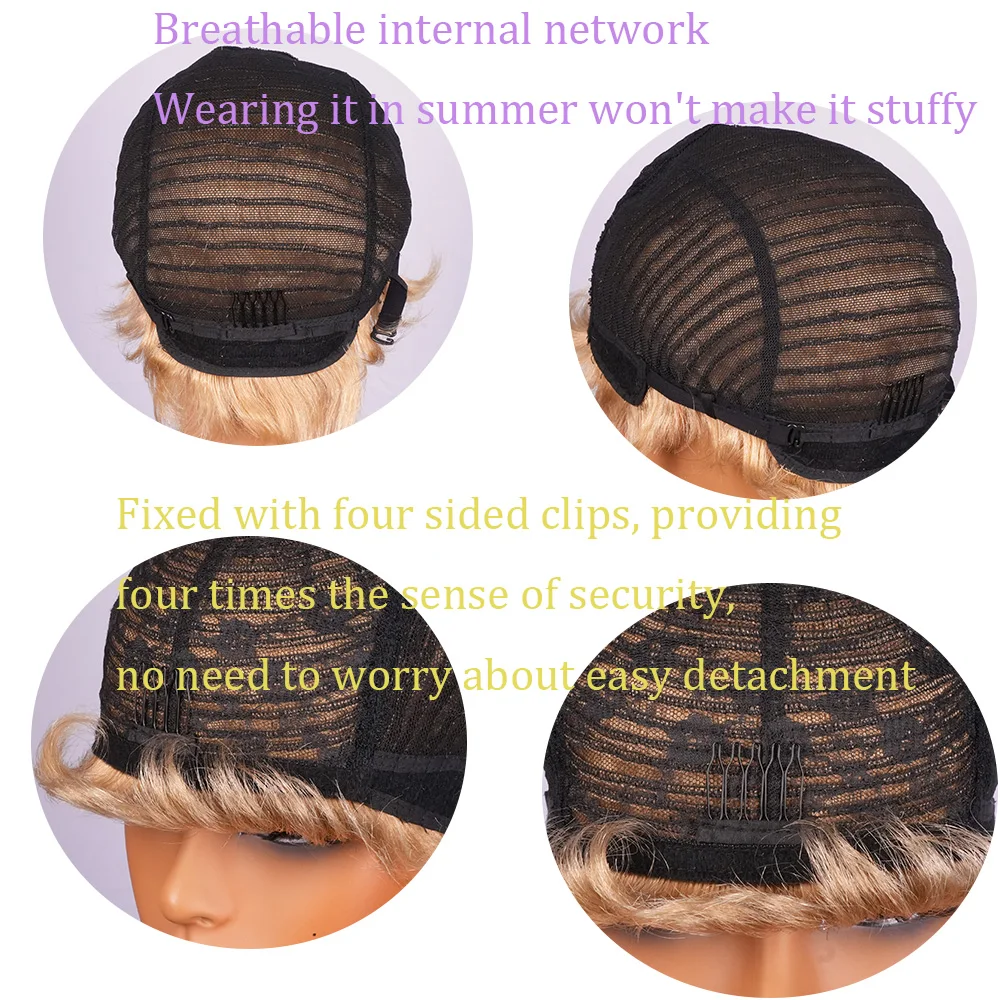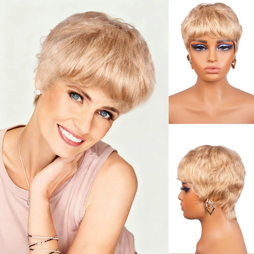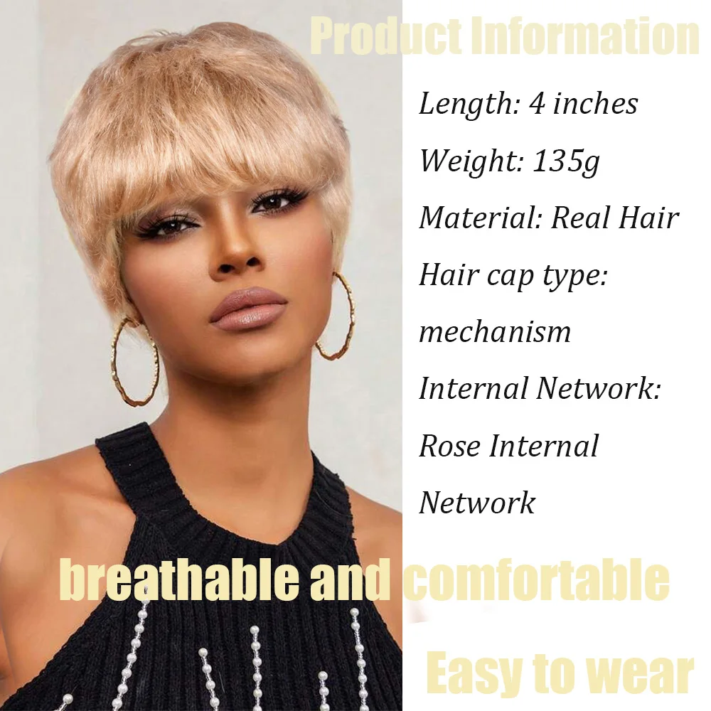 Peluca corta de cabello real con flequillo hecha a máquina para mujer
