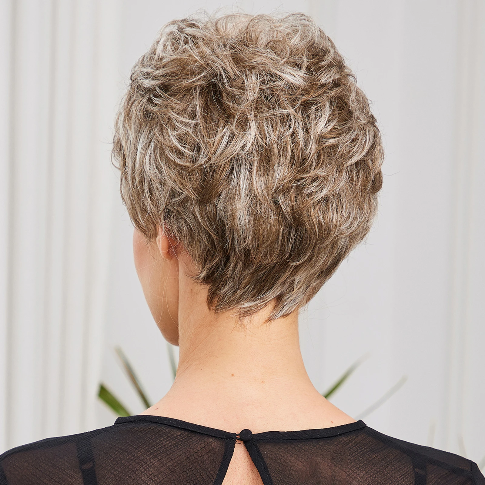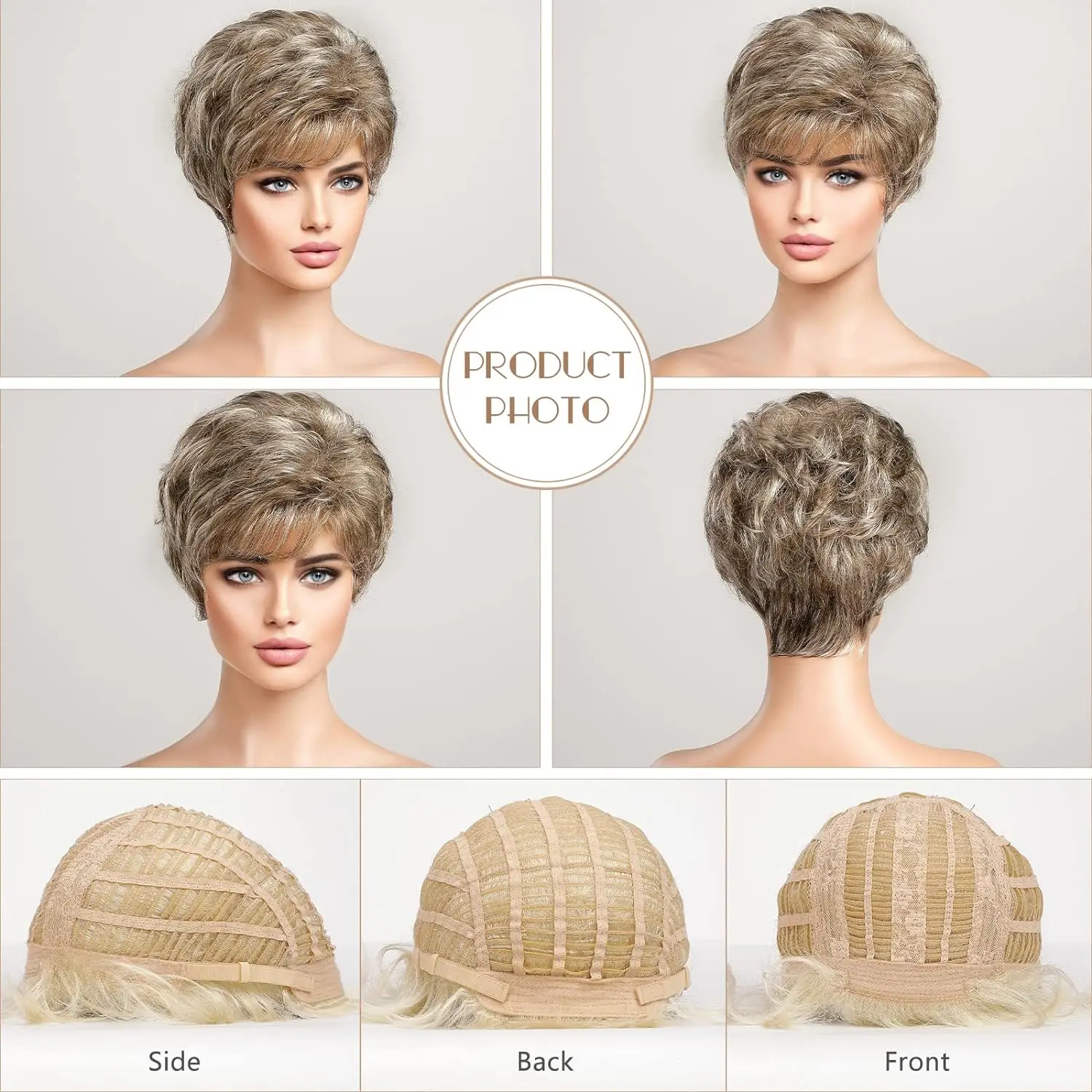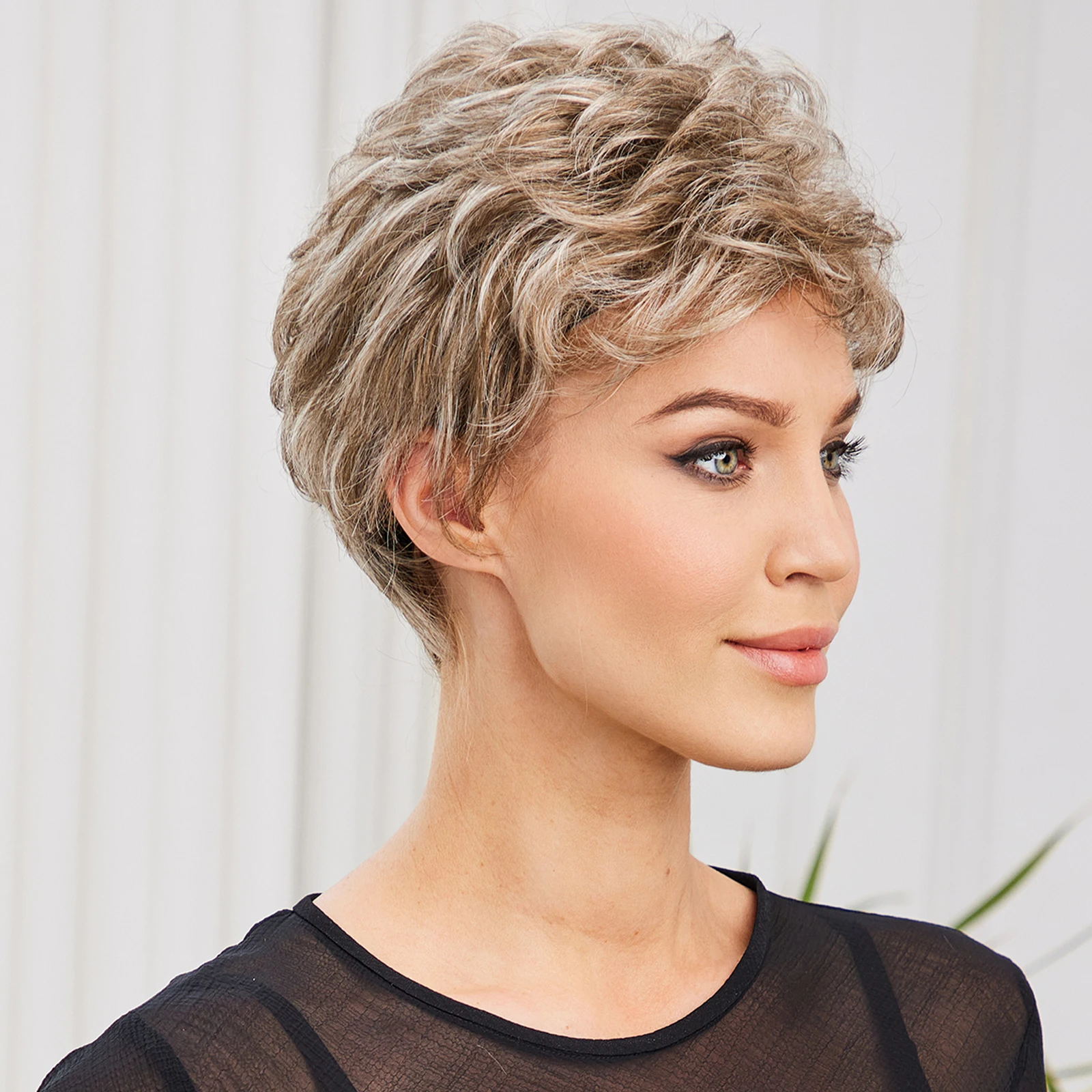 Peluca para mujer de pelo corto y rizado estilo pixie con flequillo. Fabricada con fibra de memoria de aspecto natural, ligera y cómoda, ideal para uso diario y fácil mantenimiento.