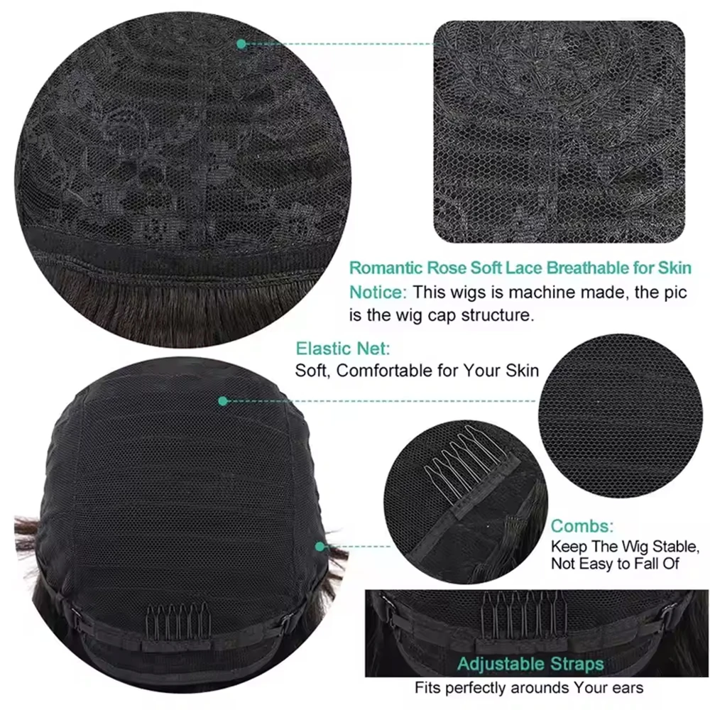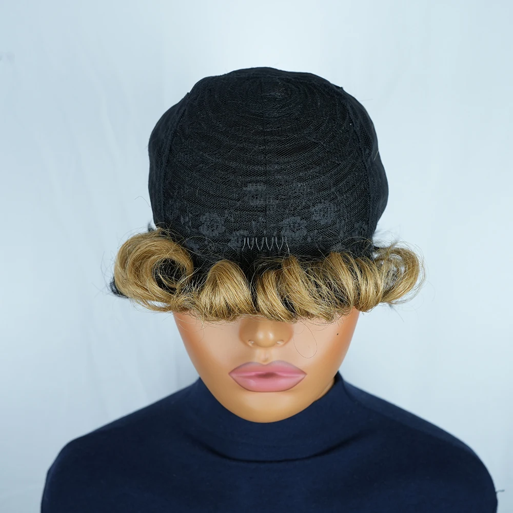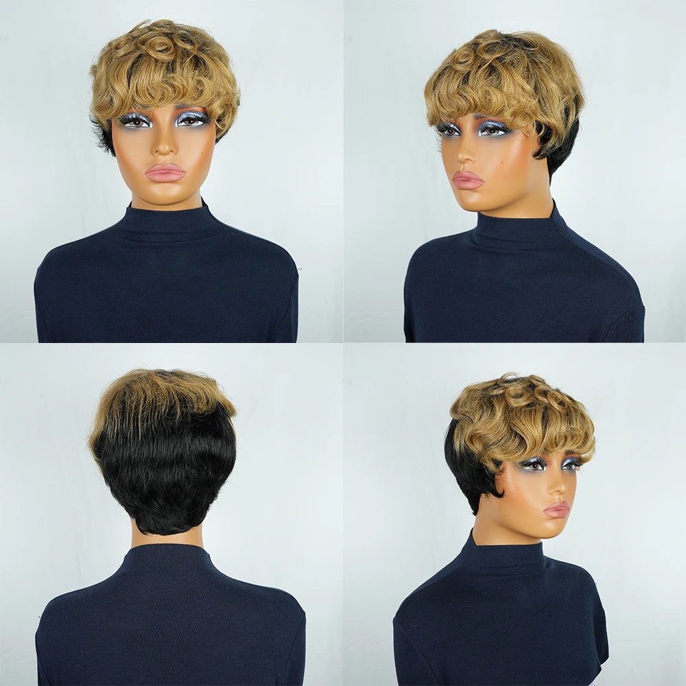 Peluca pixie corta rizada rubia ombré con flequillo de cabello humano