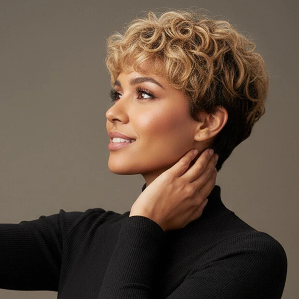 Peluca para mujer de cabello humano rizado en capas con efecto rubio ombré. Corte pixie corto con flequillo prearrancado, fabricación completa a máquina y lista para usar, ideal para un look natural, moderno y cómodo.