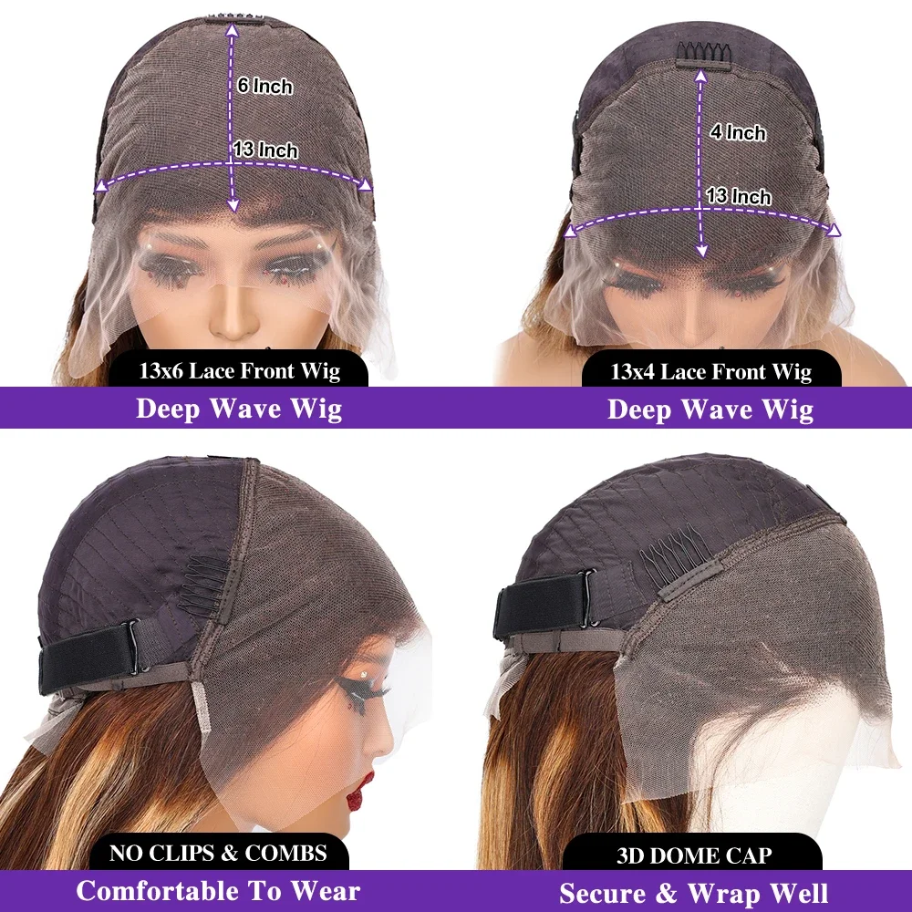 Peluca para mujer de cabello humano 100% con ondas profundas en color rubio miel. Encaje frontal HD 13×4 o 13×6 para un acabado natural, cómoda y lista para lucir un look elegante y abundante.